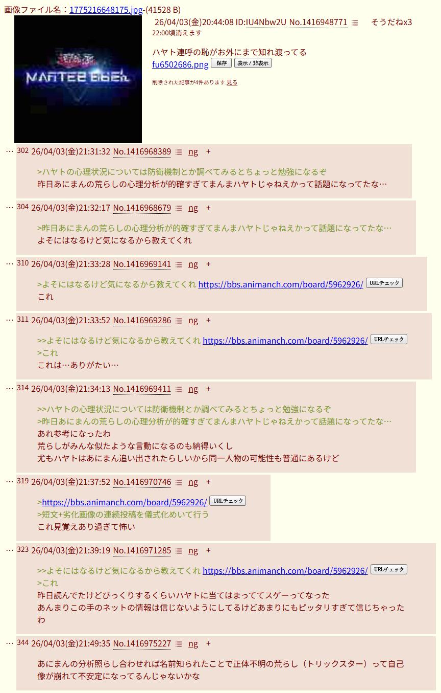 | … | 926/04/03(金)23:42:46 ID:722330NINo.1417017495そうだねx26シャンカーがホロ粘着してるって自白…? |