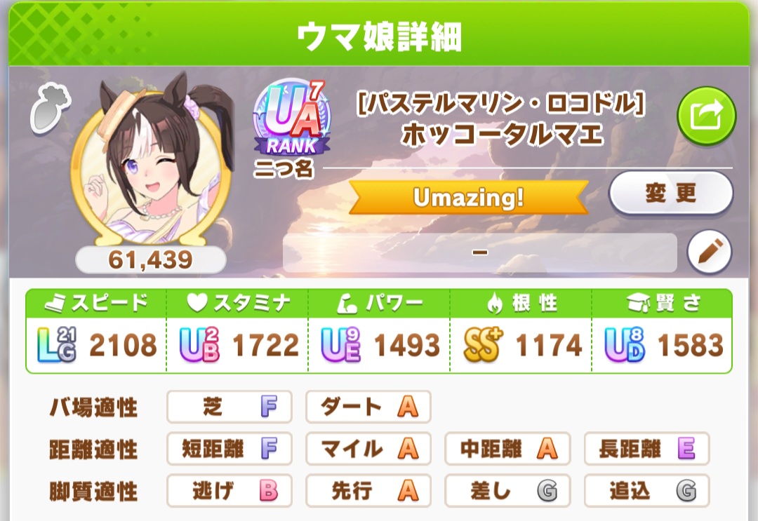 次チャンミ用のクロノちゃんができました ダートA距離S もうこれでゴールで良いです |