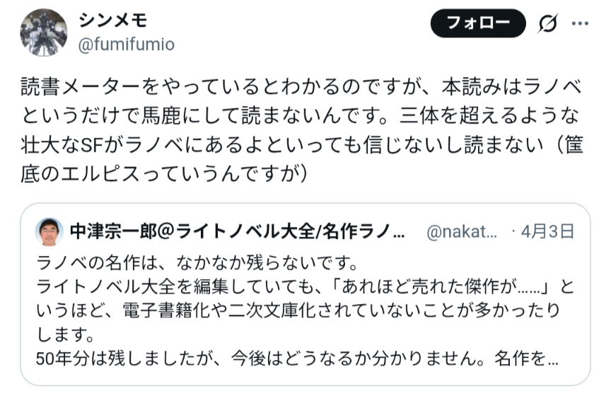 | … | 50226/04/05(日)08:04:18No.1417398948+そもそもラノベに限らず日本人自体が文字を読むという文化から遠のいています |