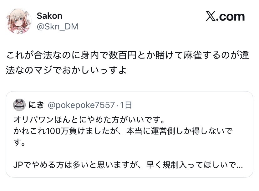 法律詳しくないんだけどポケカを賭けて麻雀すればもしかして合法?このスレは古いので、もうすぐ消えます。