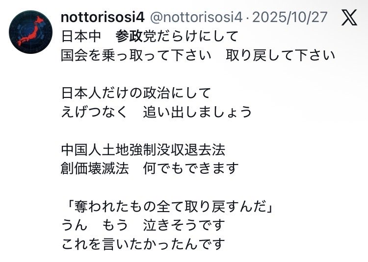 | … | 1226/04/05(日)09:19:15 ID:w0TeBficNo.1417414790+テロリスト参政党 |