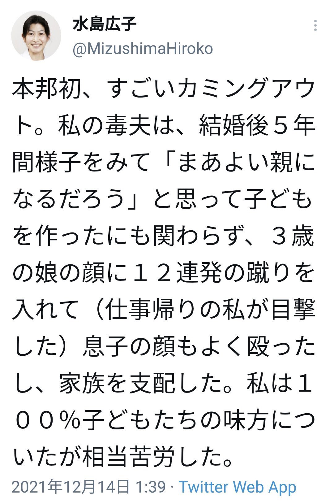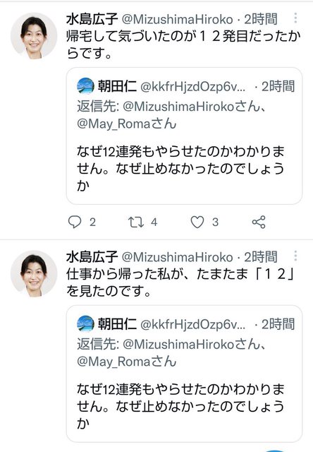 | … | 3426/04/05(日)11:51:22No.1417451974そうだねx44「なぜ止めなかったか?」とのリプライに対して、水島は「仕事から帰った私が、たまたま『12』を見たのです」「帰宅して気づいたのが12発目だったからです」と理由をリプライした。その後も「気付くまでの11発は誰が数えていたのか」「成人男性が3歳児の頭部を12回も蹴ったら殺してしまうのでは」「12連続もの足技を使う夫は何者なのか」「自宅にコンボゲージでもあるのか」などの指摘や疑問が相次いだが、水島はこれらを黙殺し、のちに一連のツイートを削除している。 |
