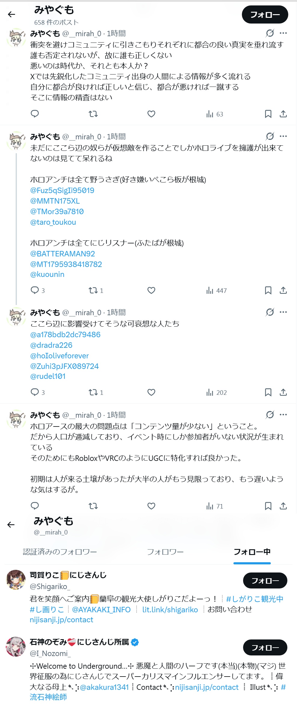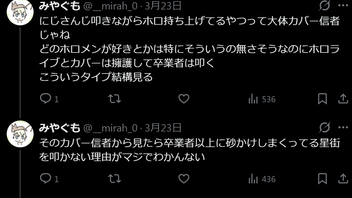 | … | 6326/04/05(日)17:57:30No.1417552888そうだねx4>にじさんじ叩きながらホロ上げてるのはカバー信者でホロ卒業者を叩いてる |
