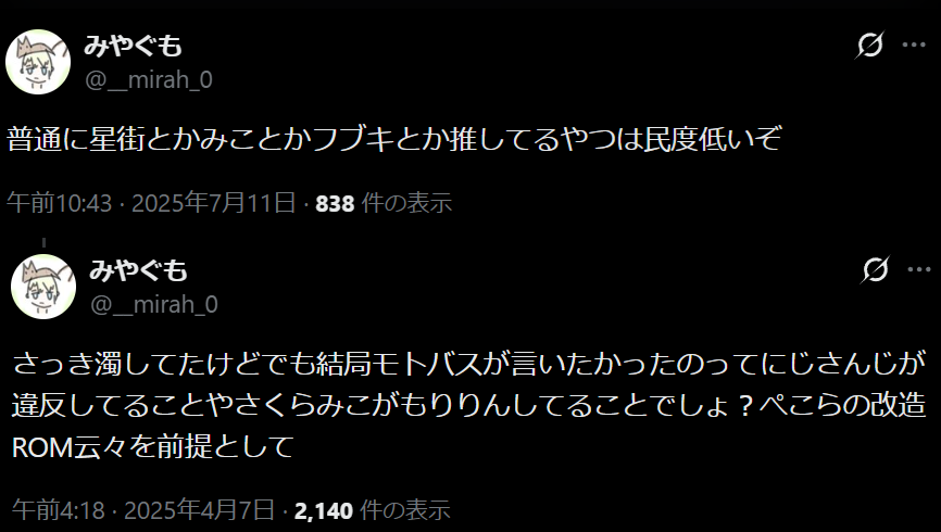 | … | 7226/04/05(日)18:08:49No.1417556508+にじさんじ本体には触れられてなくてあくまでにじリスが窘められてる程度のスレでもにじ粘着扱いするのに |