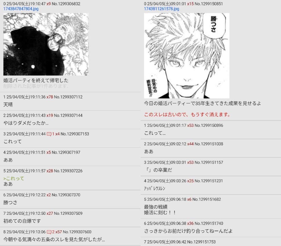 | … | 4526/04/05(日)23:29:42No.1417689850+婚活パーティとか街コンとか合コンとかなぜそんなバトルロワイヤルみたいな場所に行くのか |