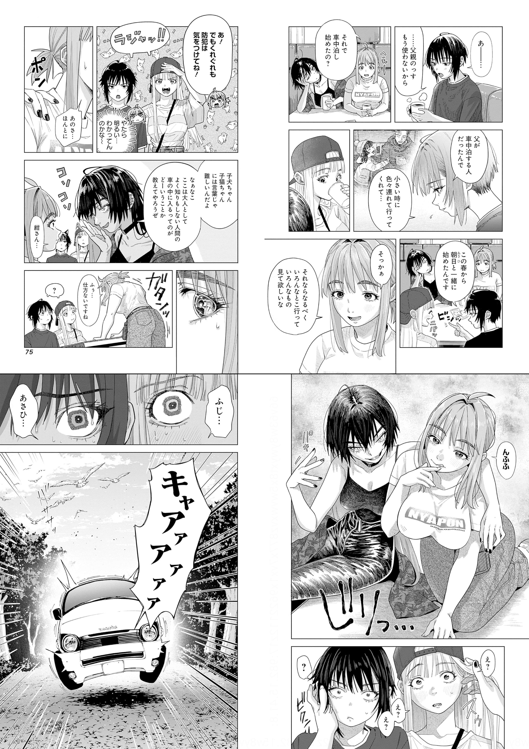 女の子の二人が車であちこち出かけて車中泊するほのぼの漫画だよ