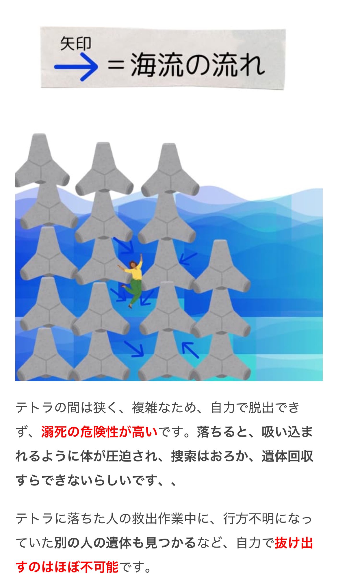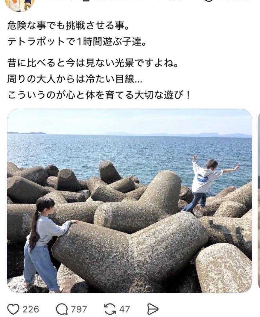 | … | 9626/04/06(月)07:16:46No.1417743826そうだねx1テトラポッドで遊ぶなとは言われた事ないけど隙間覗いてこれ落ちたらどうなるのって想像してたら自然と避けるようになったわ |