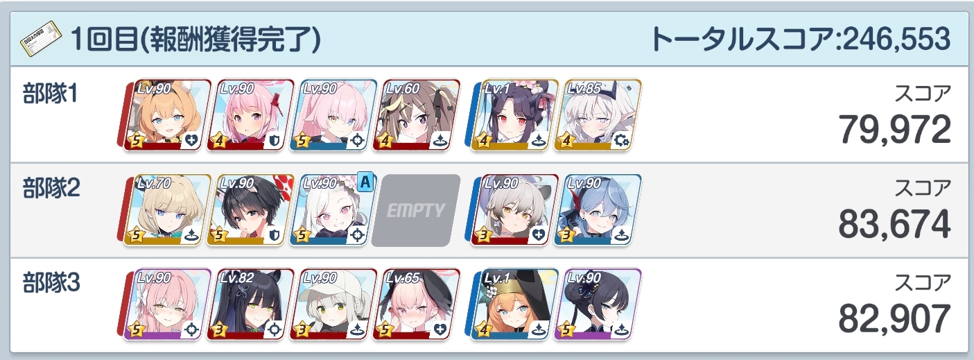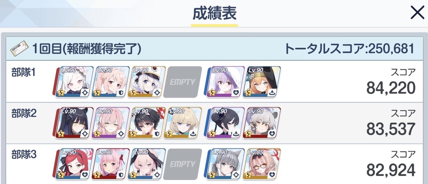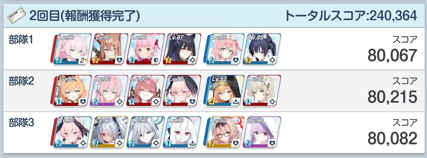 | … | 7326/04/06(月)04:55:57No.1417737829+>なるほどそういう仕組みか…よし勝った!!!!! >と思ったら135だった…単純に俺が下手なんだろうけど140への道のりは遠い >fu6513863.jpg その手持ちだとギミック対応した後に臨戦ホシノ水着ハナコ水着コハルを早く使えればスコア伸びるから無理にストライカー4枠埋めなくてもいいんだ 水着ナギサで踏み倒してもいいしリオでコピーしてもいいけど |