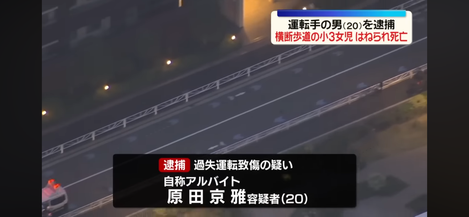 | … | 9126/04/06(月)09:46:08No.1417761127+2日午後5時半ごろ、横浜市戸塚区戸塚町の交差点で、近くに住む小学3年生の中西由衣さん(8)が乗用車にひかれ、病院に搬送されたが約1時間半後に死亡した。神奈川県警戸塚署は、乗用車を運転していた自称同市栄区飯島町、アルバイトの原田京雅容疑者(20)を自動車運転死傷処罰法違反(過失運転致傷)の疑いで、同日に現行犯逮捕。容疑を過失運転致死に切り替えて捜査している。 |