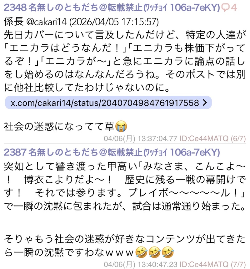 | … | 2626/04/06(月)13:18:38No.1417801103そうだねx1>河崎翠なんてフォローする奴いるんだ |