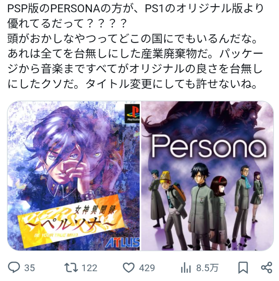 PSP版ペルソナが産業廃棄物? PS1オリジナル擁護の声がファンに広がるこのスレは古いので、もうすぐ消えます。