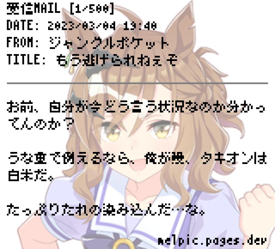 | … | 14126/04/06(月)19:29:36No.1417885123+ポッケがうな重でタキオンが白飯のイメージは分かりやすいし新時代の扉っぽい関係性だよねというレスを見たことあるが意味が分からなかった |