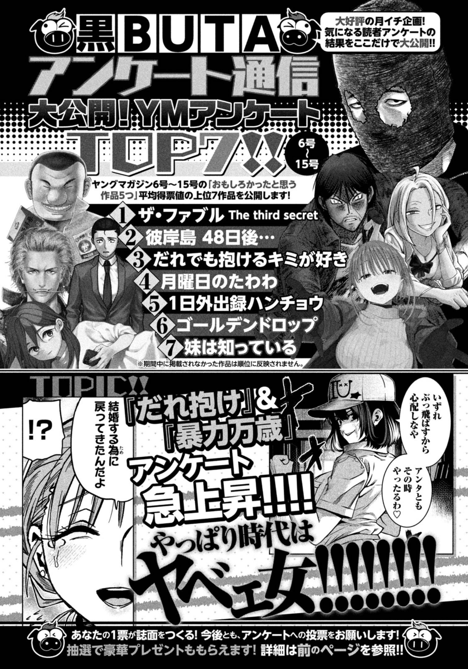 | … | 1626/04/06(月)20:24:53No.1417905025+>アンケ系は女性票が強いみたいな話を聞くけどヤンマガはそうでもないんだな |