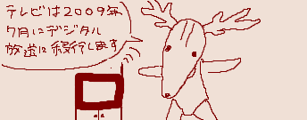 | … | 19126/04/06(月)23:40:53No.1417979173+二足歩行のシカに黄色い競泳水着を着せて地デジとド直球な文字を刻んだ安易なのに意味がわからないマスコットだ |