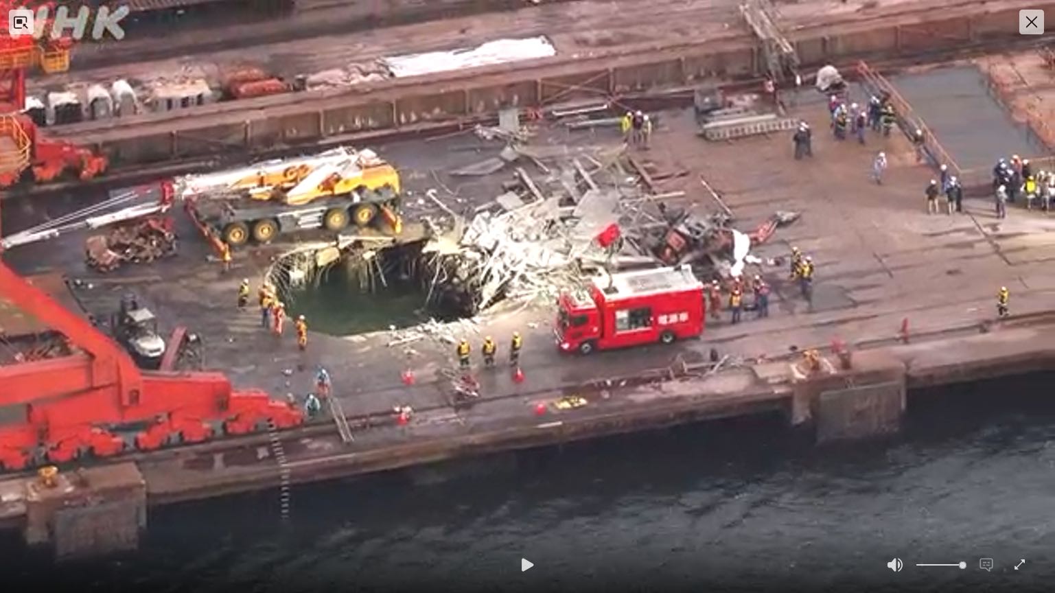 署によると、隣接する船の積み荷の鉄鉱石を移動させるための大型クレーンの解体作業中だったという。クレーンの上部に設置していたドラム状の重りが何らかの原因で落下し、作業員の足場も崩落したとみられるという。未発見の1人は、落下当時、重りの上で作業していたとの情報もあるという。