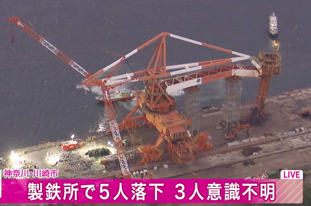 落下したのは男性作業員5人で、このうち4人が救助されましたが3人が意識不明の重体、1人は病院に搬送されるときに意識はあったということです。また、1人の行方が分からなくなっています。