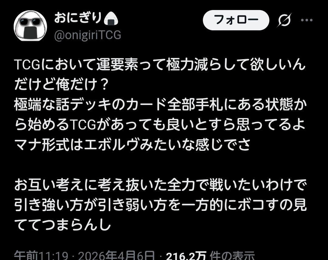 | … | 7226/04/07(火)19:45:08No.1418171518+>これ運要素排斥した場合の欠点突き詰めてくとTCGじゃなくなるんだよな |