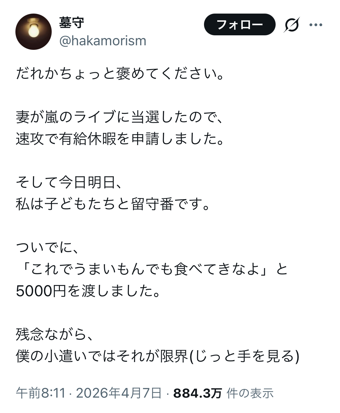| … | 6026/04/07(火)23:10:14No.1418246696そうだねx18>わざわざ自分の小遣いから5000円出すっていや凄いけど…そんなに妻のライブ当選を応援してたの? |