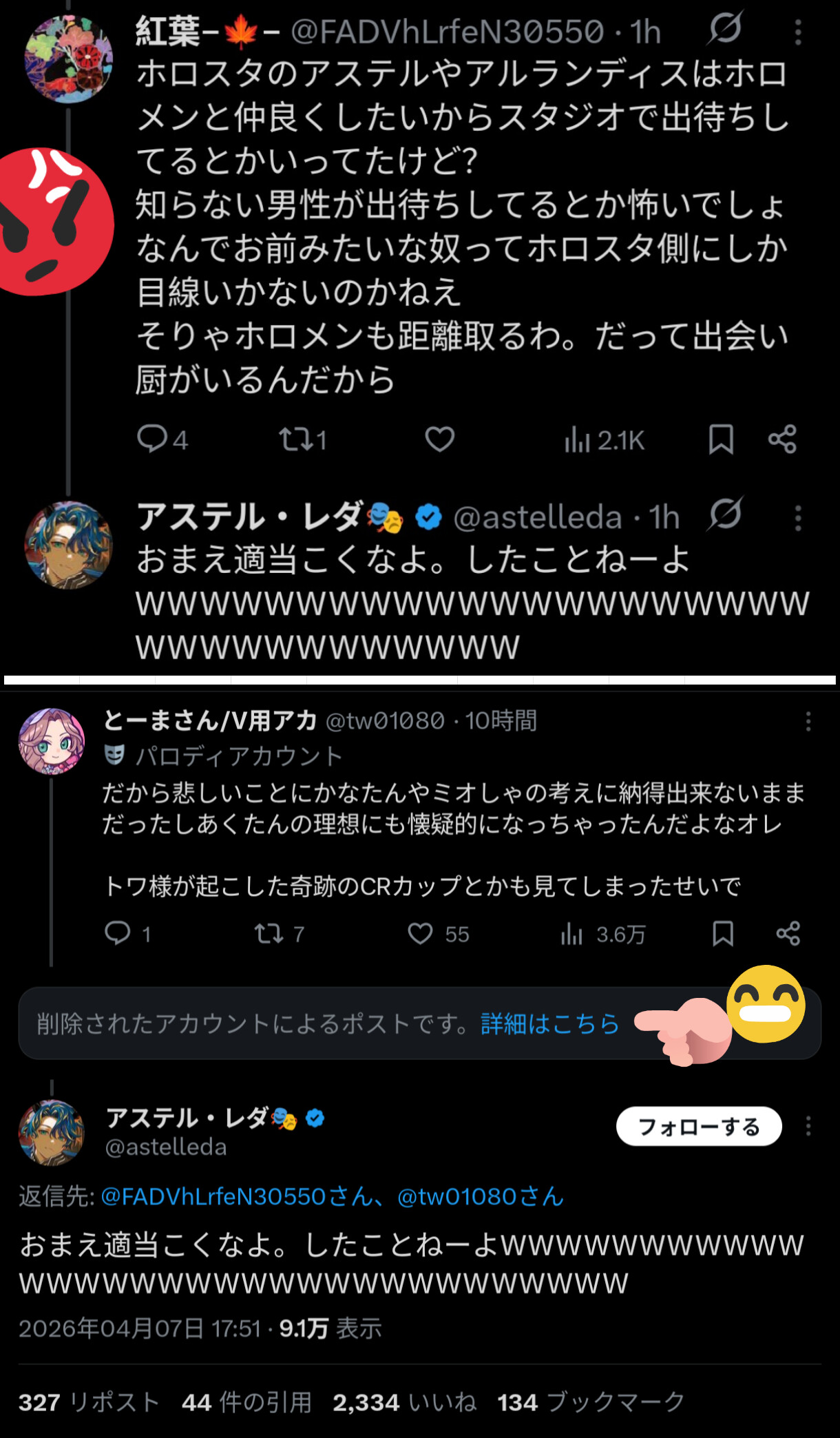 | … | 9526/04/08(水)09:51:37No.1418321264+>>本人にデマ流したの認識されてんのに垢消しは悪手じゃない? |