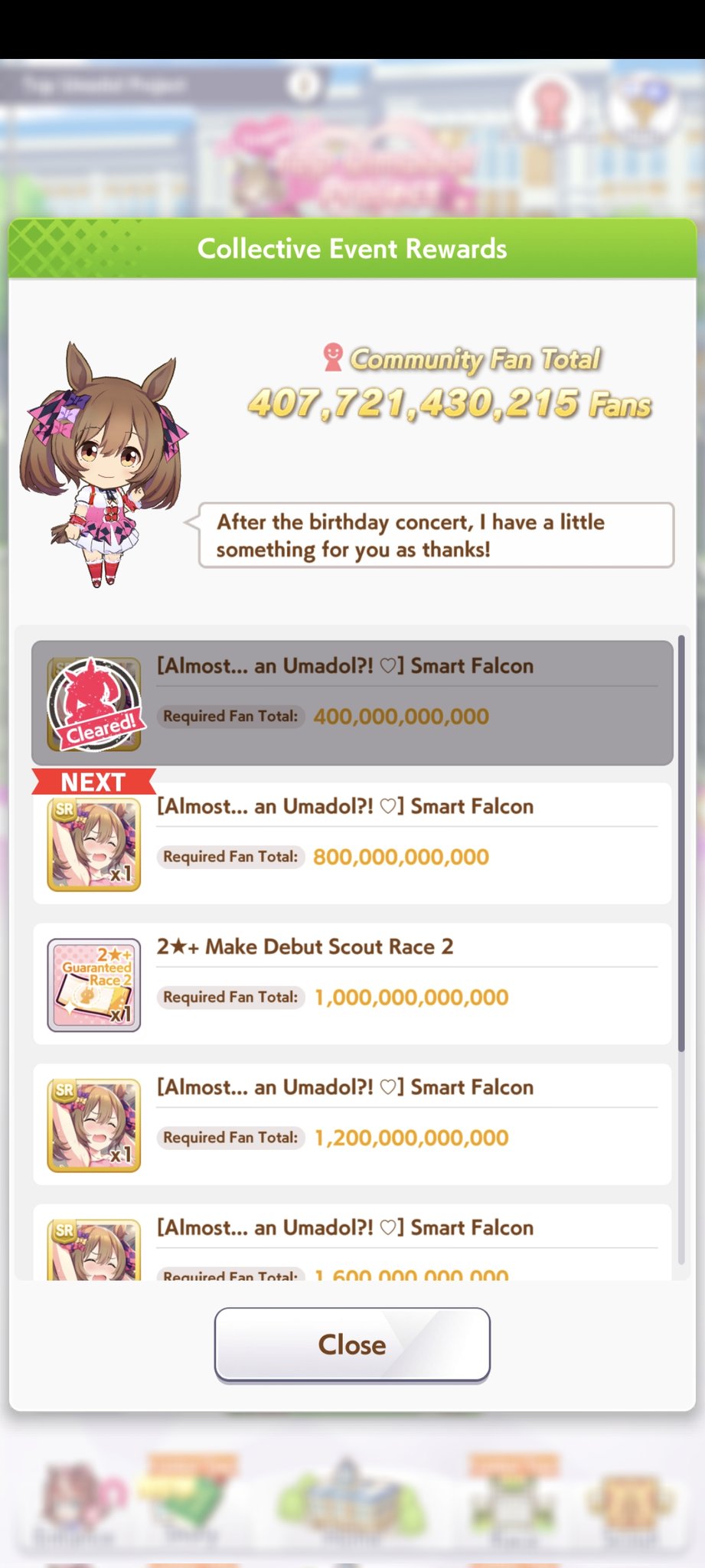グロ版ウマ娘で開催中のファルコイベにてファン数目標を日本版と同じにしたら未達になりそうで調整このスレは古いので、もうすぐ消えます。