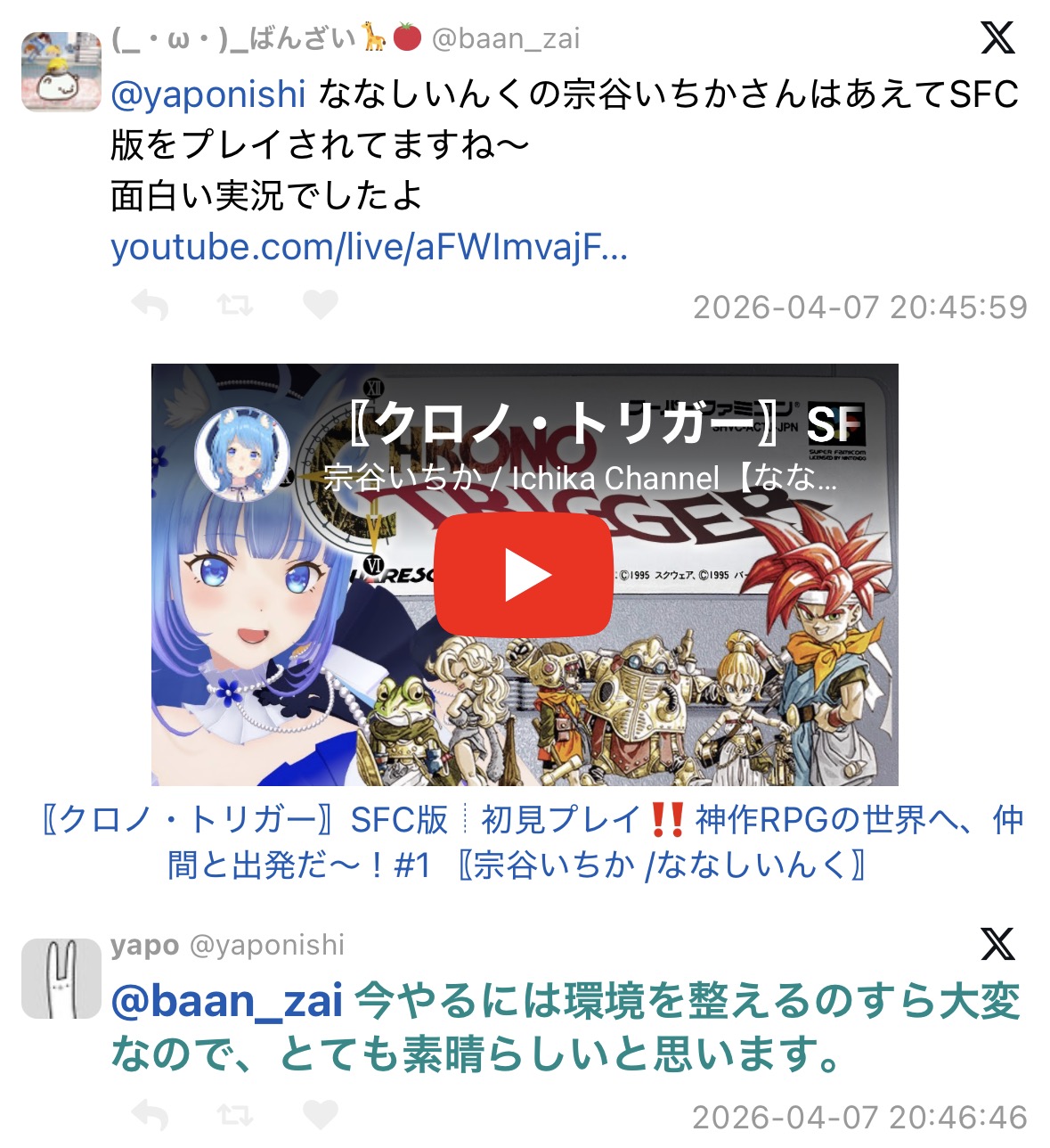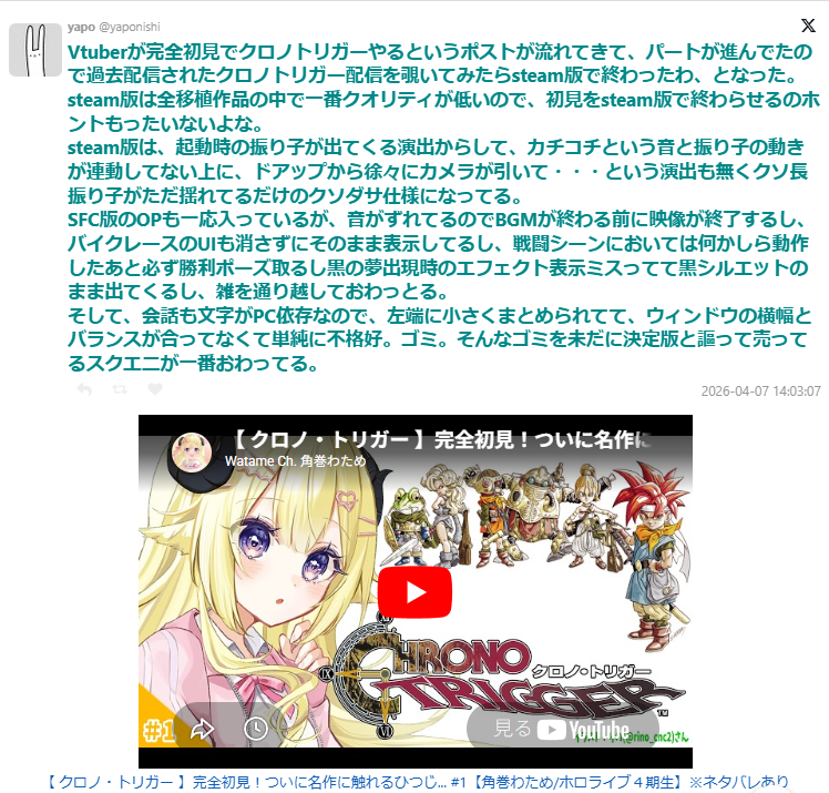 | … | 6826/04/08(水)18:52:42No.1418433863+この人配信者とかに限らずクロノトリガーのリメイクの話になるとこんな感じだから怖い |