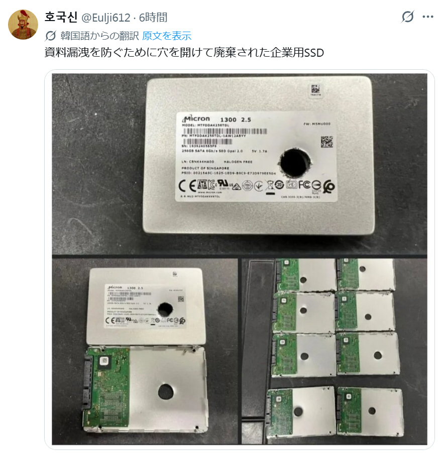 | … | 21526/04/08(水)20:02:32No.1418456218そうだねx1SSDは別に殻開けるの簡単だし基盤とチップバキバキにすればいいだけだからHDDより楽だ |