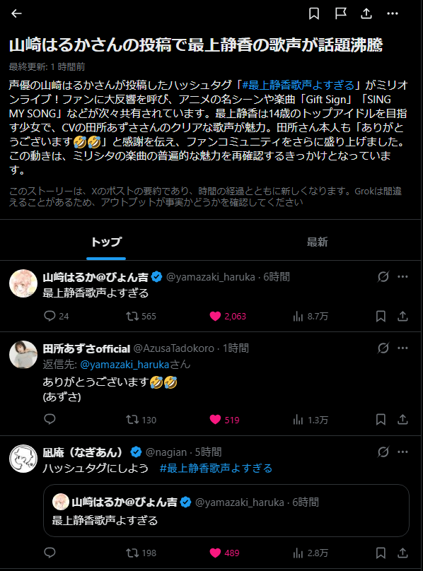 | … | 1326/04/08(水)20:47:01No.1418478182そうだねx3なんかオタクがキャストから反応もらってて羨ましい |