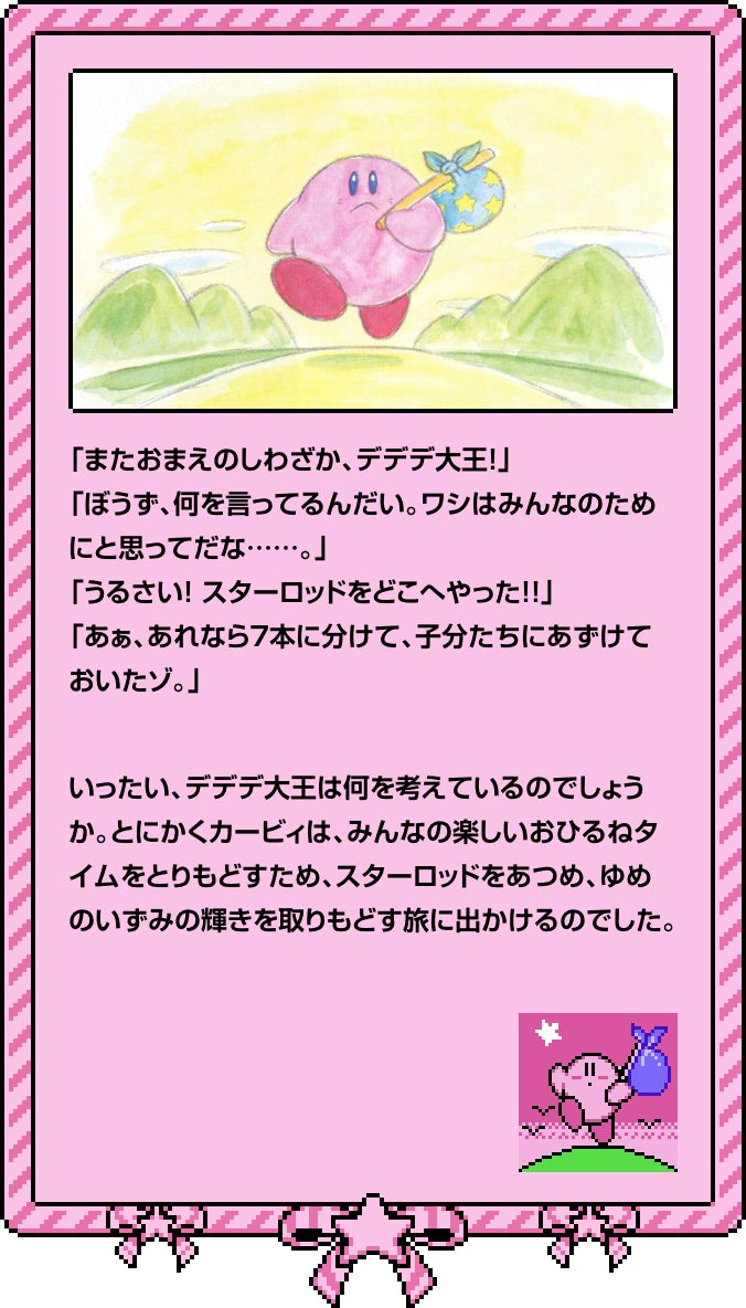 | … | 4626/04/08(水)23:57:20No.1418556519+>はぁ〜い、ぼくカービィ!リボンとはお星さまがふる夜に出会ったんだ(これって運命?)。ぼくの新しいワザ「コピー能力ミックス」があれば、どんな冒険もへっちゃらさ!リボンのために、ポップスターのなかまたちと力を合わせて「クリスタル」を探し出すよ! |
