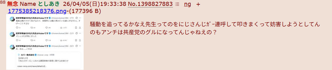 | … | 126/04/09(木)09:57:39 ID:OvJqdhOYNo.1418619312そうだねx4まさはるまで拗らせてるのヤベーな… |