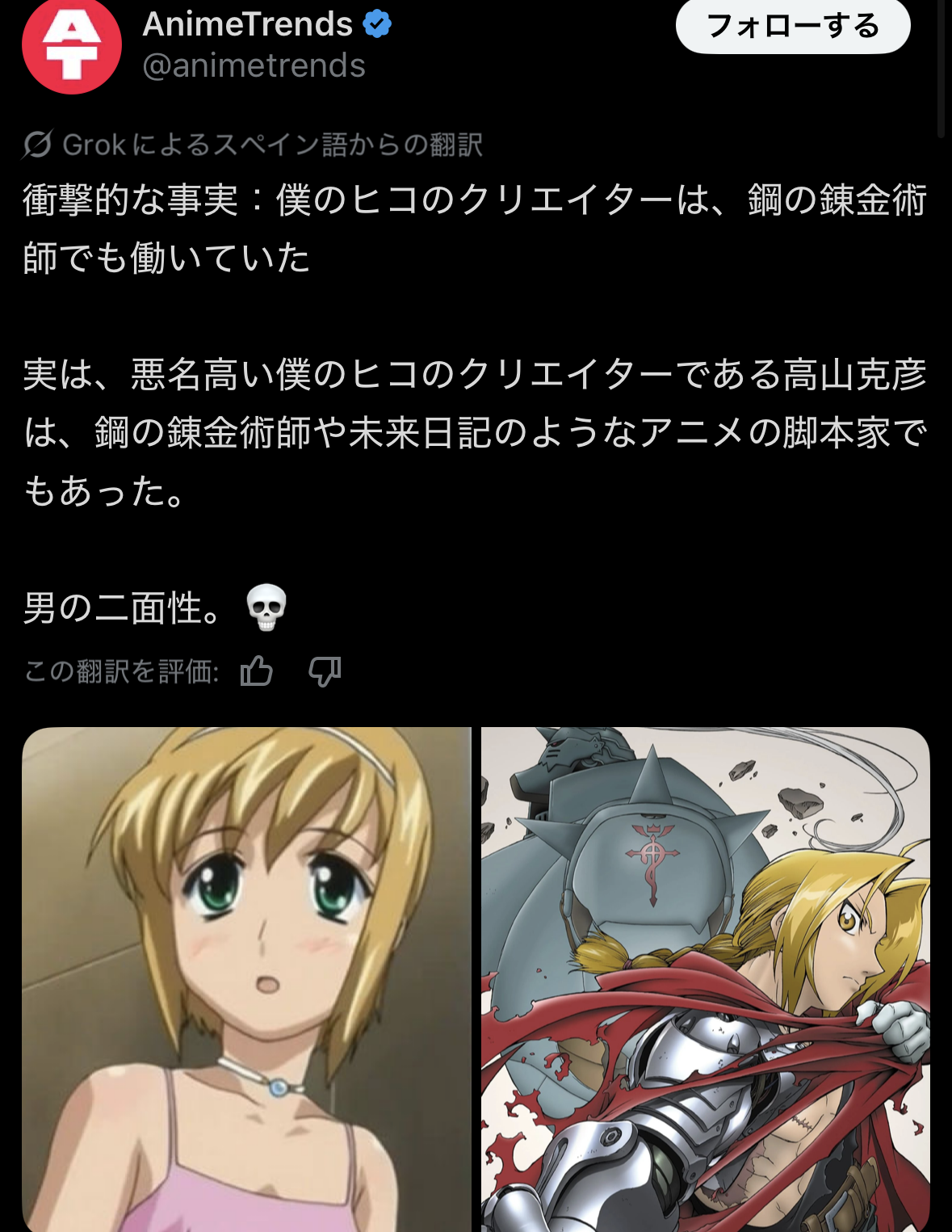 | … | 2826/04/09(木)12:34:25No.1418649552そうだねx1>ゲイになるから皆見るなって向こうで言われてるアニメだから悪名高いアニメでいい気がする |