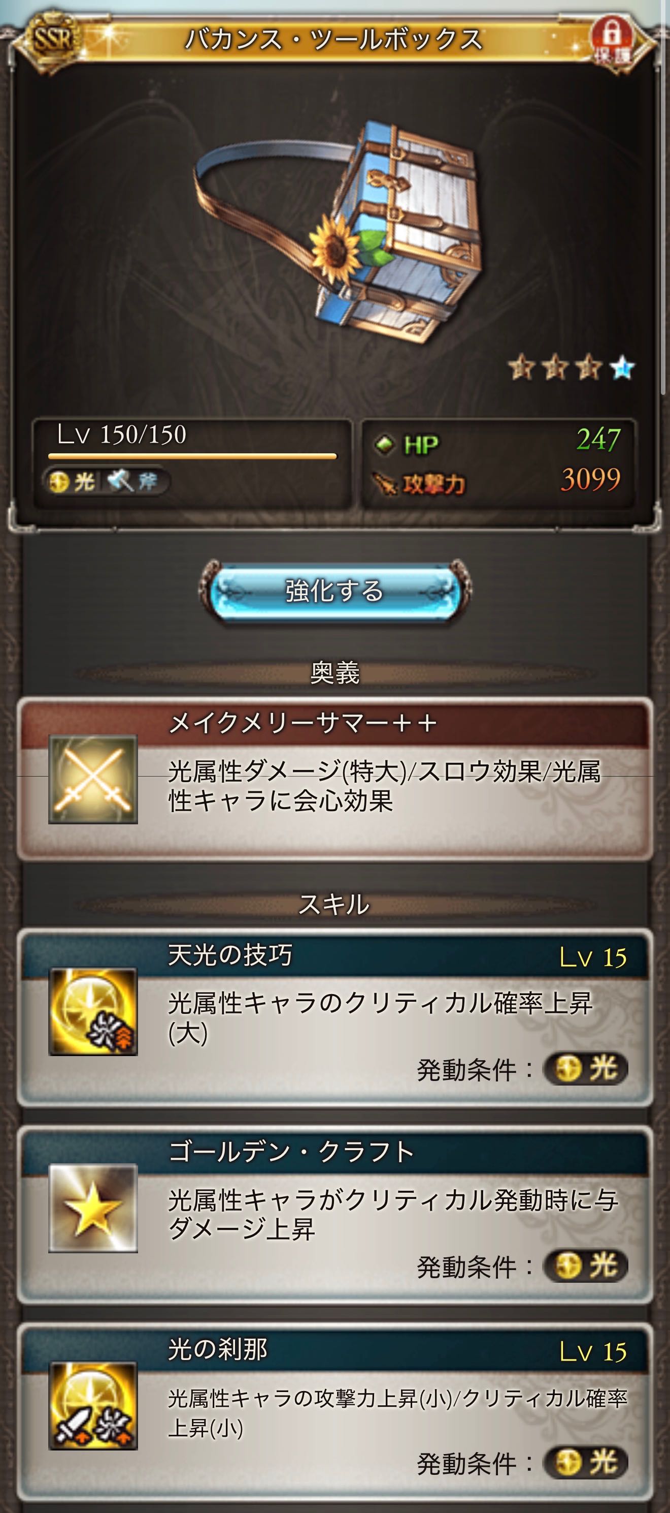 | … | 2526/04/09(木)15:35:28No.1418688393+>スキル1『白銀の支配者』 >光属性キャラの攻撃力上昇(極大/EX枠) >スキル2『アストラル・ピアース』(Lv120で習得) >光属性キャラのHPが多いほどアビリティダメージ上限UP(最小10%〜最大50%) >◆メイン装備時 >※武器Lv200でメイン制限解除 >※オメガ/終末武器のアビ上限と共存不可 本当に1T目だけなら強いな |