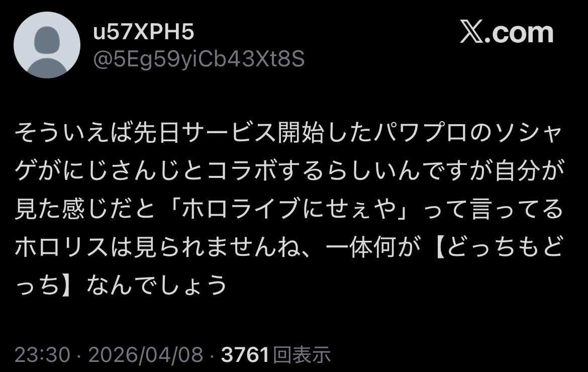 | … | 50026/04/09(木)19:24:42No.1418743341+>>つべ規約違反してまでにじさんじの為に報酬配ったパワプロソシャゲはサ終しましたね |