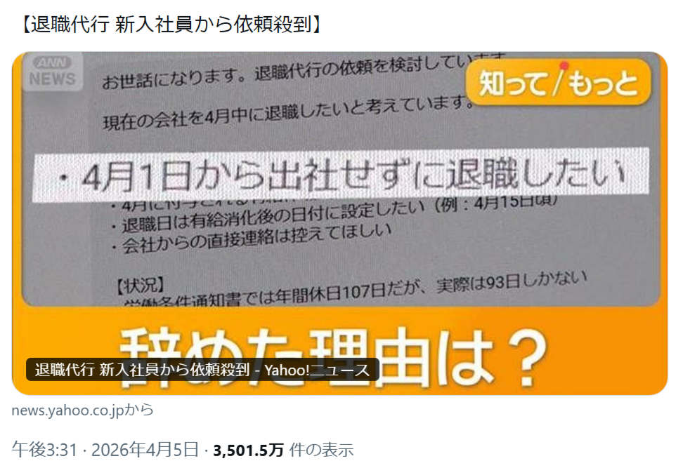 | … | 4426/04/09(木)21:46:44No.1418793876+入社日に辞めたいでも有給使いたいってそもそも無理なこと言ってるのやばくない? |