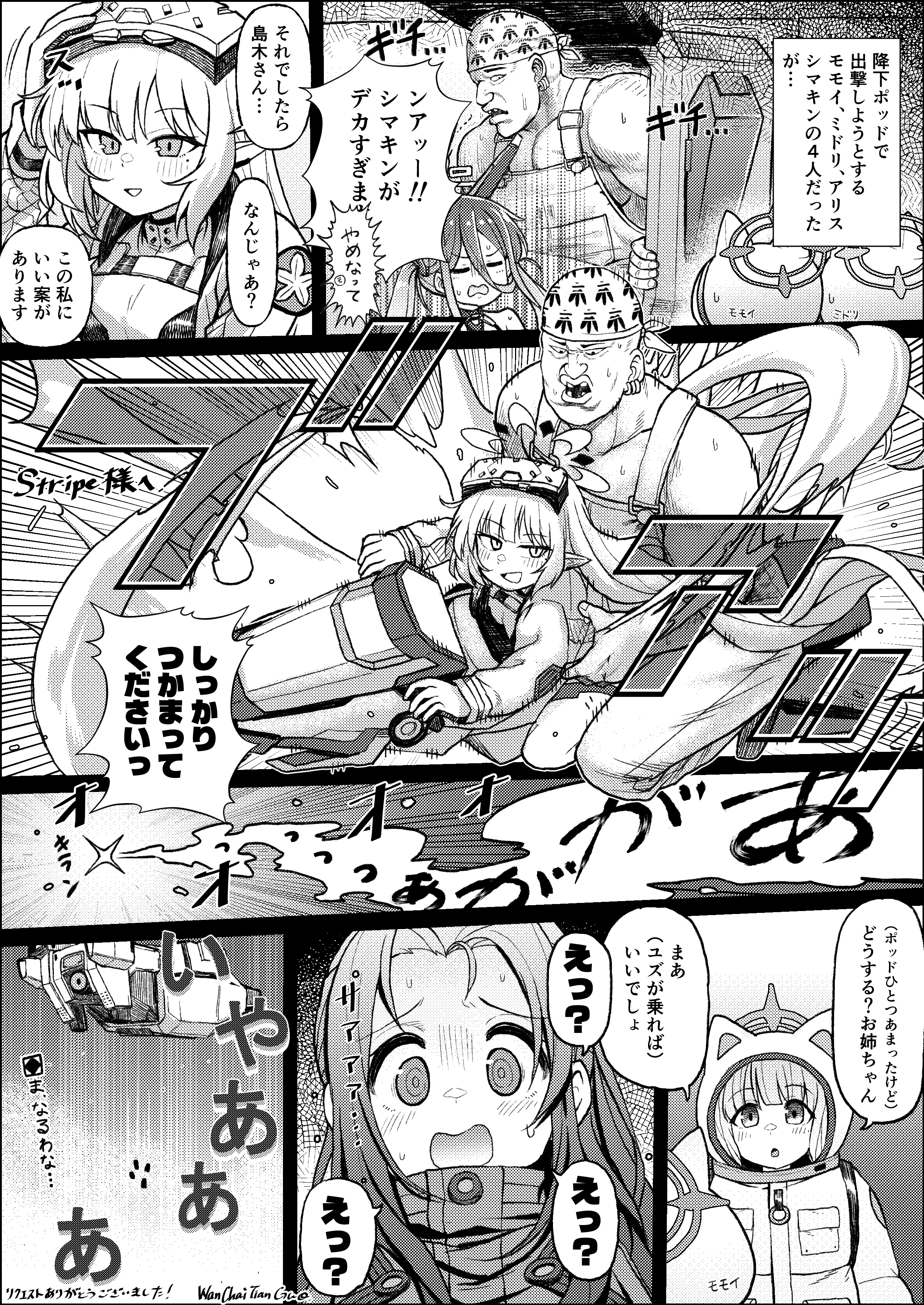 「シマキンが降下ポッドで鋼鉄大陸に降下しようとしたらデカすぎてポッドに入らなかったので、ヒマリの屋外用車椅子に二人乗りして出撃する漫画をお願いします。…」