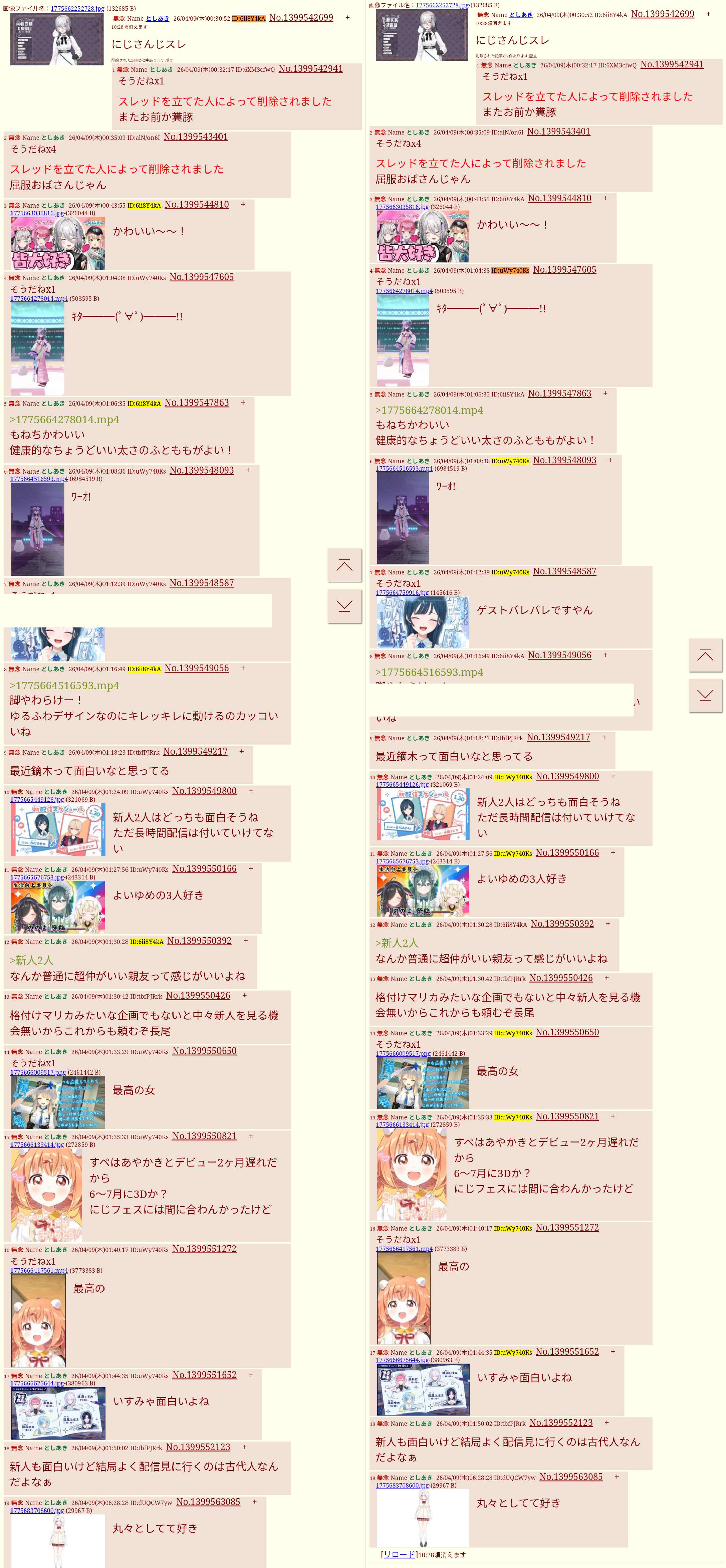 | … | 5026/04/10(金)12:35:21No.1418930986そうだねx5>>荒れることなく完走したホロライブスレ |