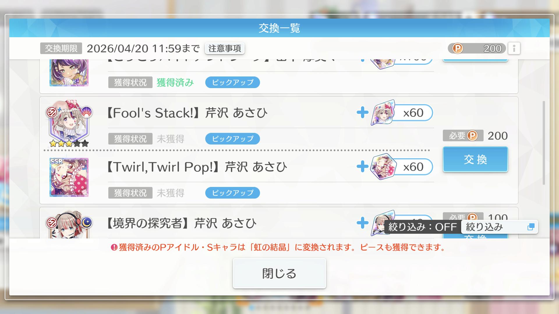 | … | 1826/04/10(金)12:20:36No.1418926670+ステップアップでなんとか摩美々とあさひ揃った ☆2が各1人ずつしかでなくて結晶がいてぇ |