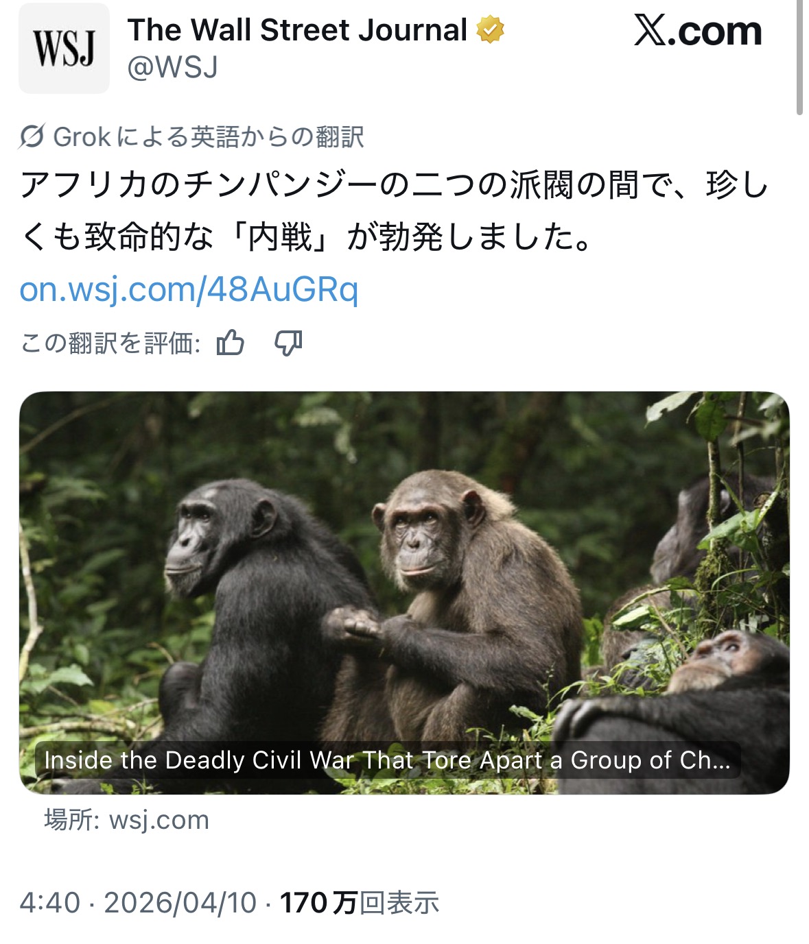 | … | 226/04/10(金)12:53:16No.1418936367そうだねx15チンパンジーの内戦って大体致命的だろ… |