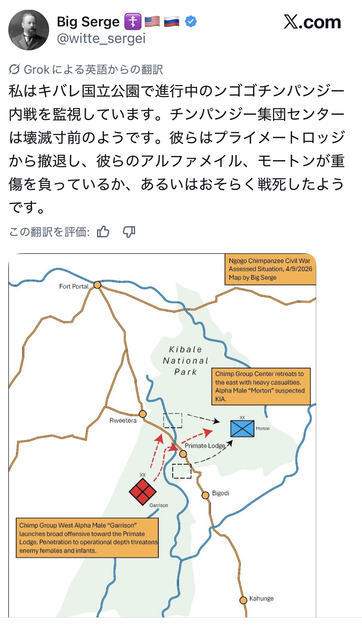 | … | 1426/04/10(金)13:04:23No.1418939291そうだねx31974年にも群れが分裂して激しい内戦になった記録があるから |