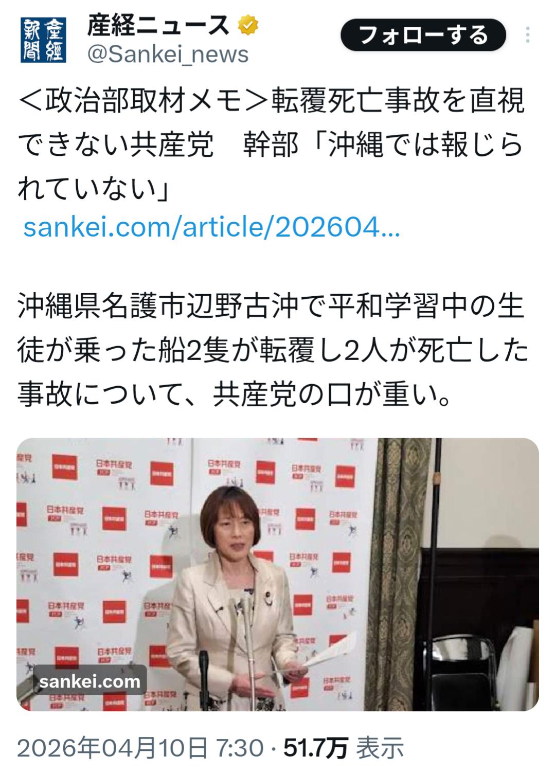 | … | 2426/04/10(金)15:14:37No.1418966326そうだねx1産経以外が報道しない自由を行使してるというより産経が共産党にも沖縄にもガンガン取材や質問してる行動力がすごい |