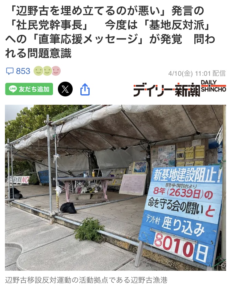 | … | 6026/04/10(金)15:28:09No.1418969070そうだねx2「事故が起きたのは辺野古の埋め立て工事が悪い」と吐き捨てた社民党の幹事長なんて謝罪するどころか反対派に応援メッセージを出して遺族を煽ってるんだぞ |