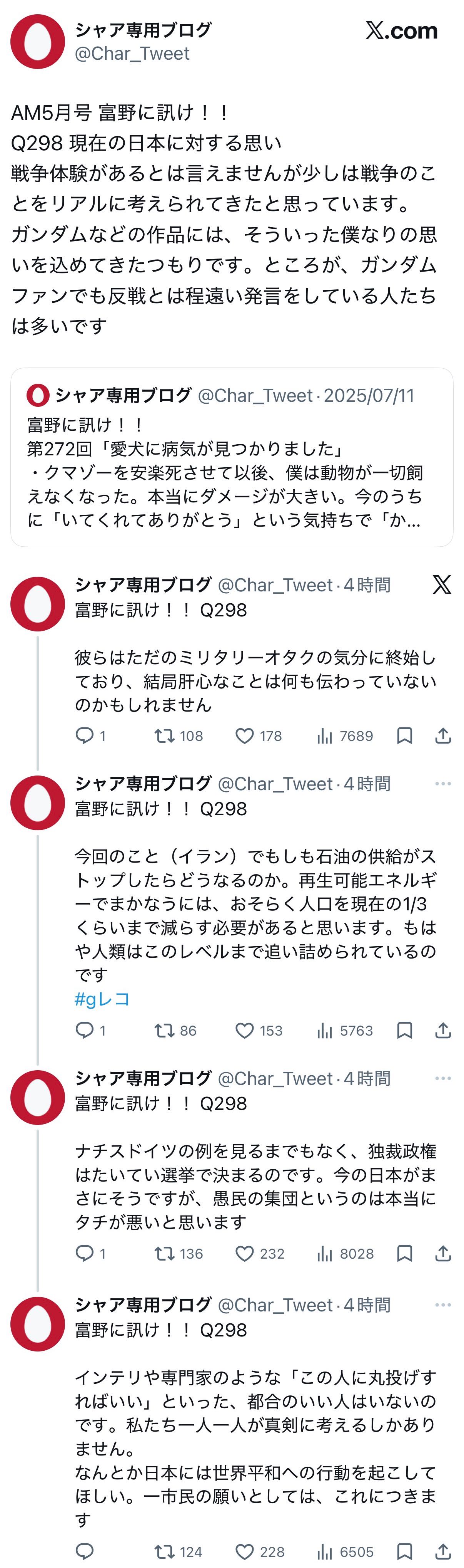 「少子化をなんとかしなければいけない、とかほざく奴は産んだ後の世界を何も考えていない!人がただ増えるだけを目的とするならばそれは虫と同じである」みたいな感じで言ってて闇雲に少子化だからといって人が増えればいいってもんじゃないみたいな事言ってたから割と人口減少賛成派だよね