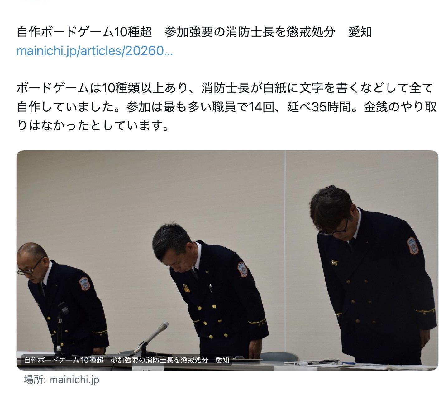 >処分は9日付。消防士長は2024年7月~25年1月、仮眠時間を含む勤務時間中にトランプやしり取りなどのルールに模した自作のボードゲームへの参加を同僚らに強要し、断った職員を無視するなどした。1月、職員の1人が職場に報告して発覚。消防士長は「コミュニケーションの一環だった。深く反省している」と話しているという。
