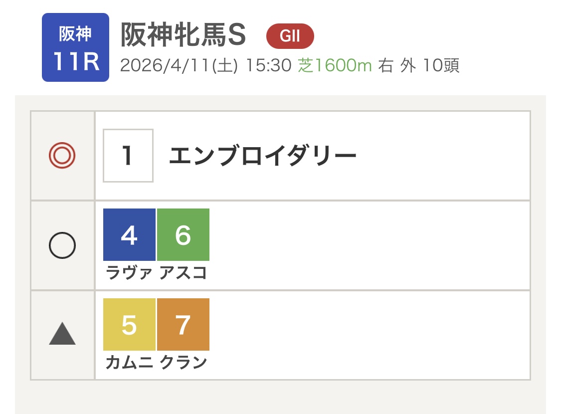 | … | 5226/04/10(金)18:33:55No.1419010110+>ところで阪神牝馬Sは誰を買えばいいんですか? |