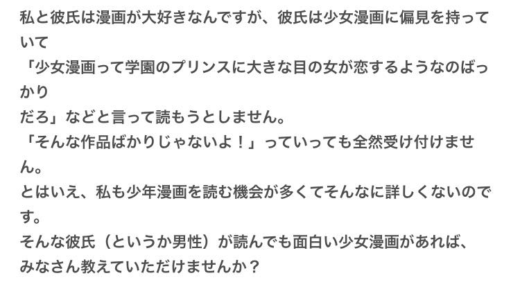 | … | 7626/04/10(金)19:19:02No.1419026032そうだねx1>何故男は少女漫画を読まないのか |