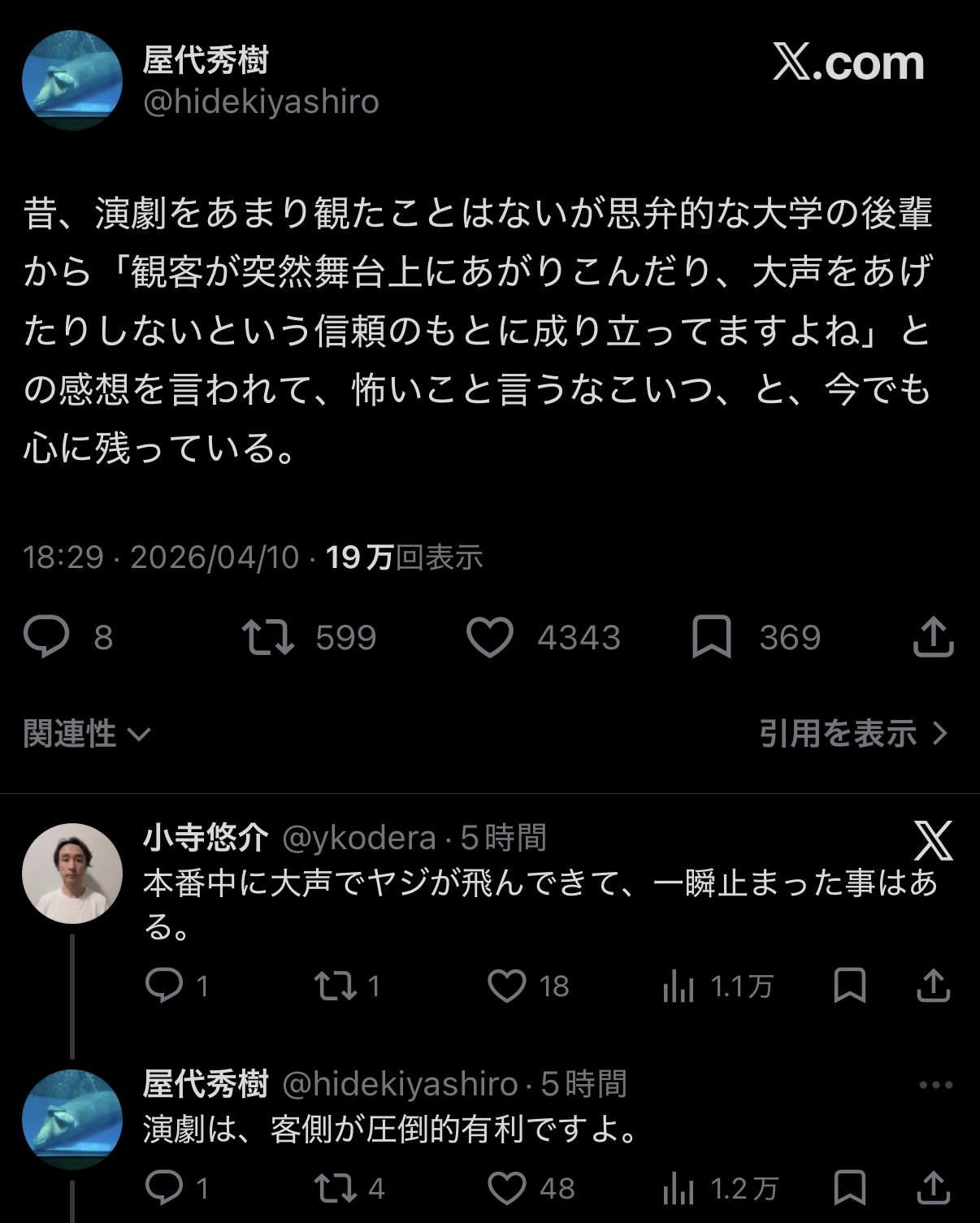 | … | 7826/04/11(土)01:59:35No.1419170425そうだねx1演劇関係なく世の中全部そうじゃんよ |