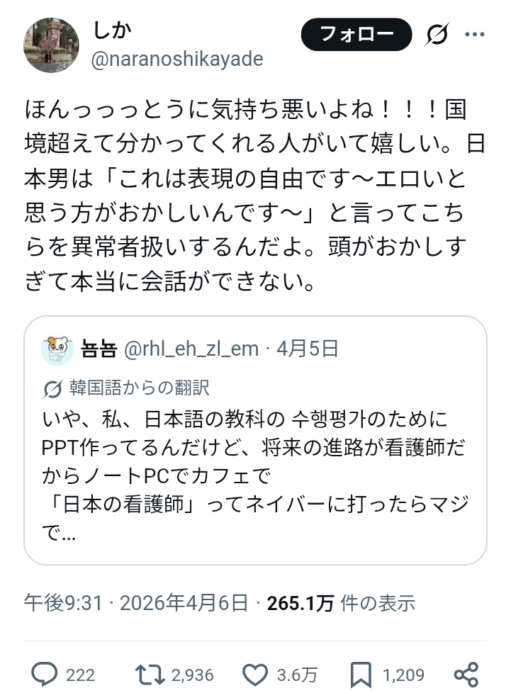 | … | 826/04/11(土)02:02:15No.1419170732そうだねx2韓国人はスケベエってこと? |