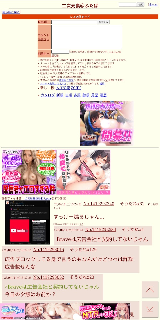 | … | 326/04/11(土)15:27:29No.1419293052そうだねx24>Braveは広告会社と契約してないじゃん |
