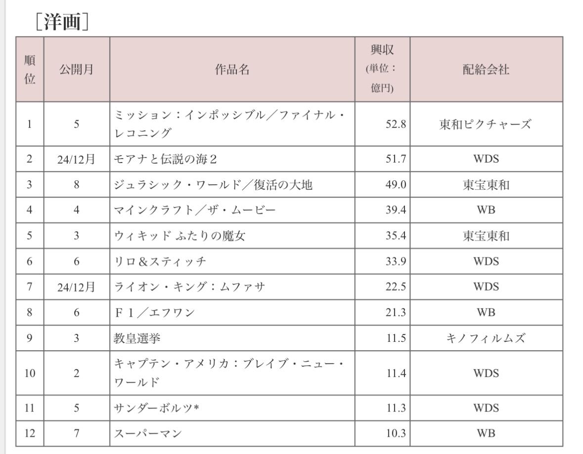 | … | 7826/04/11(土)16:11:00No.1419304922そうだねx1>2025年(2024年12月〜2025年11月)の洋画ランキングはこんな感じ |