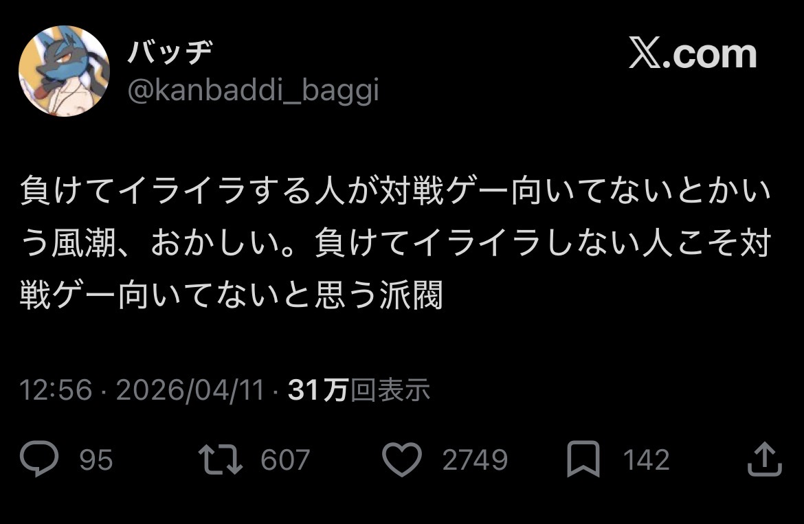 | … | 226/04/11(土)15:56:20No.1419301149そうだねx8負けてイライラする人は向かないって言説は怒る=反省点にしないってロジックを言い含めてるから |
