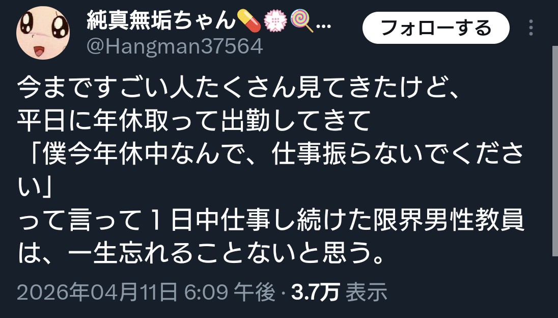 | … | 3826/04/11(土)21:49:22No.1419421561+休みは別に取れるけど休み明けに溜まった仕事や前日の引き継ぎの手間を思うと結局使えずに腐らせるだけになっちゃう |